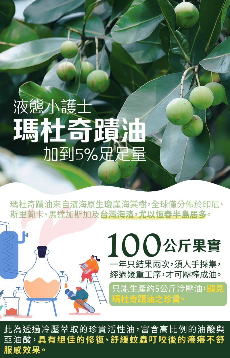 全成份:辛酸/癸酸三甘油酯(歐盟ECOCERT天然認證植物油)、檸檬桉醇PMD(來自檸檬桉葉油)、瑪杜奇蹟油、茶樹精油、尤加利精油、薄荷精油