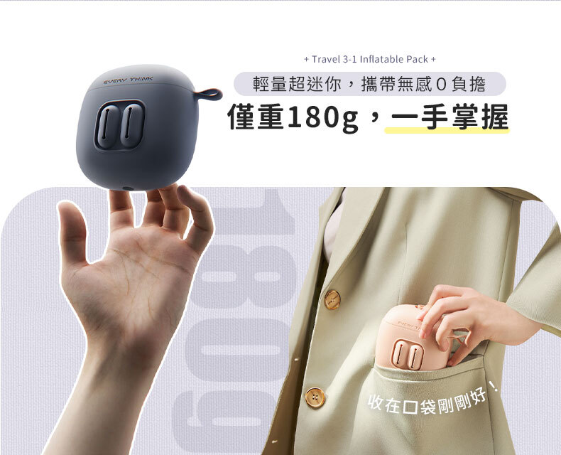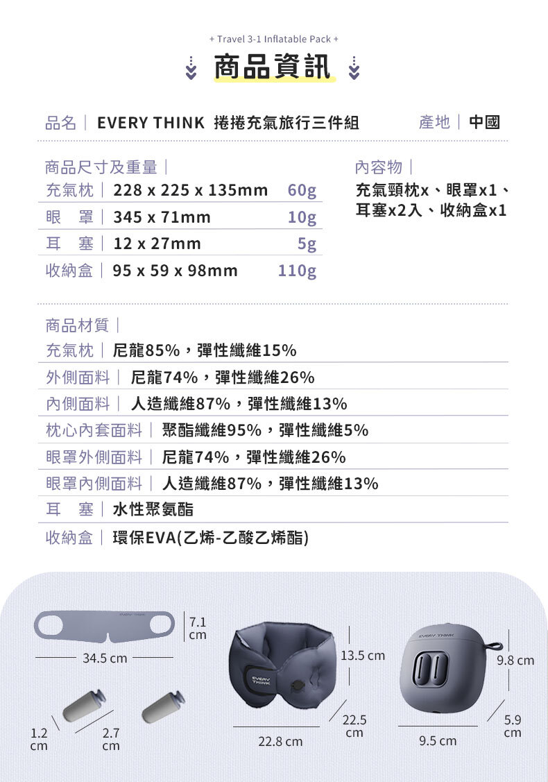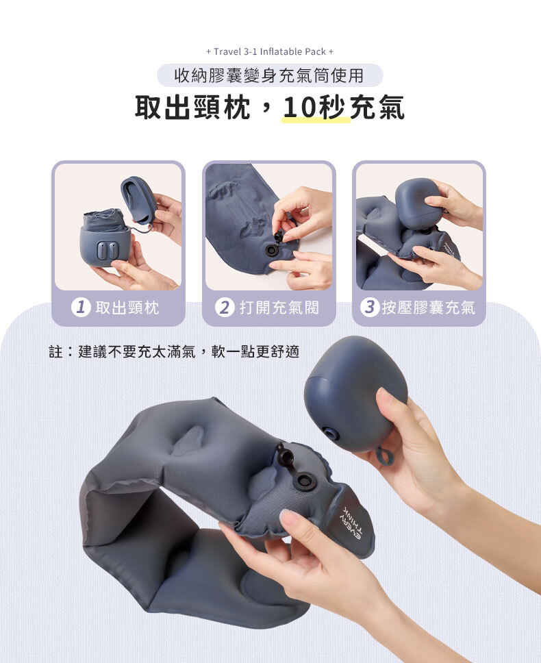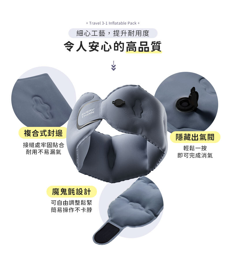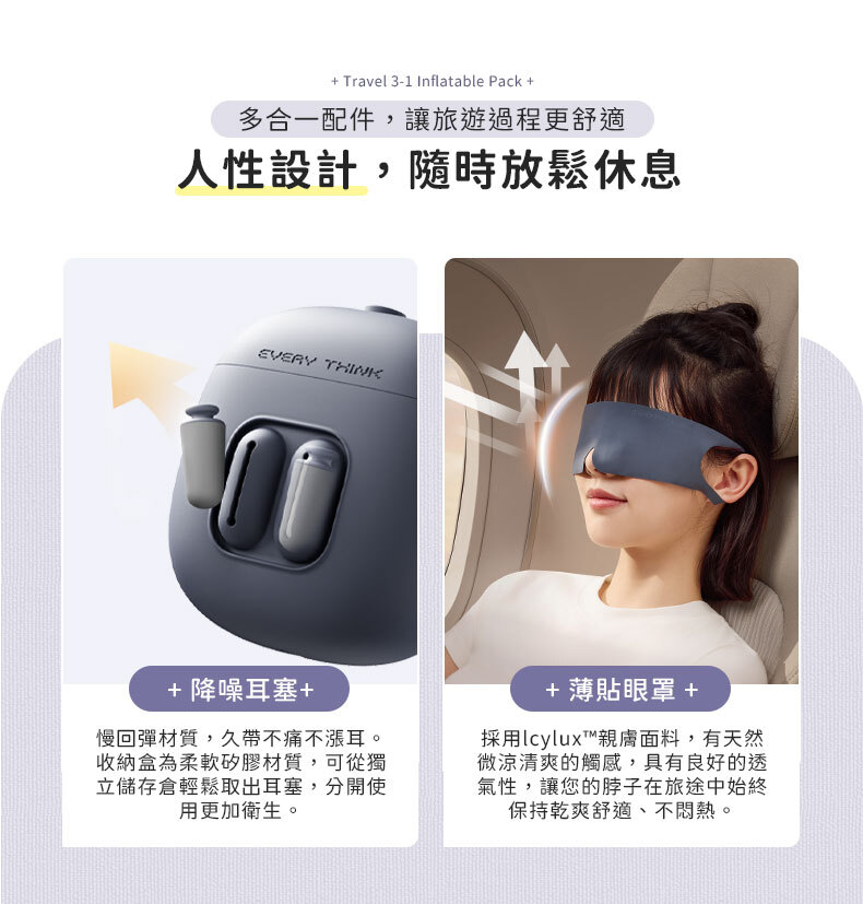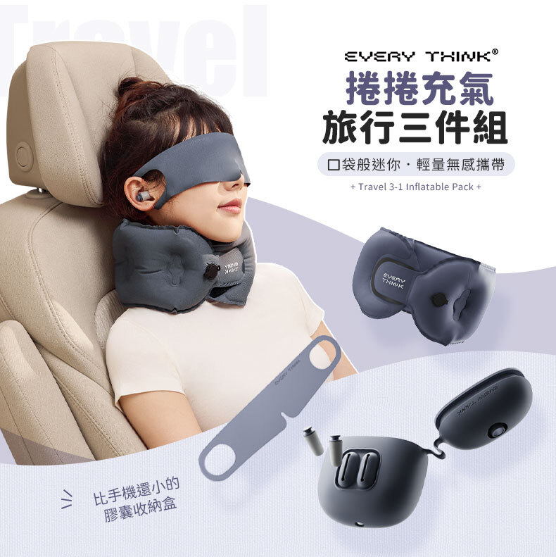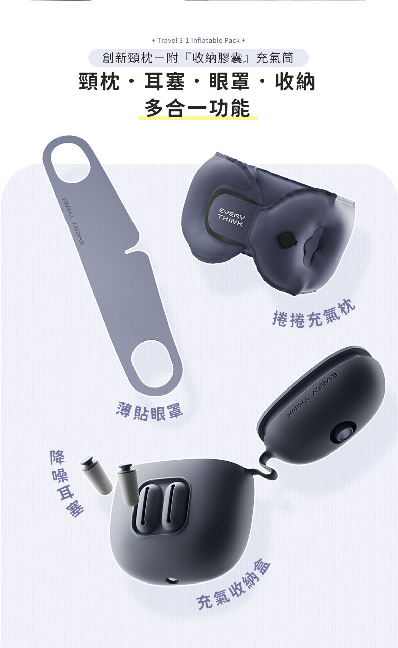 商品詳情 ◇口袋迷你設計,輕巧好攜帶◇充氣頸枕 : 360°全方位支撐 ◇薄貼眼罩 : 親膚透氣,配戴不悶熱◇降噪耳塞 : 慢回彈材質,久戴不痛不漲耳◇收納盒兼充氣筒,一盒多用 捲捲旅行充氣三件組(頸枕+眼罩+耳塞) TWD $1,480 TWD $1,180